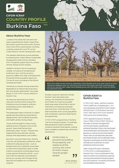 ICRAF has worked in Burkina Faso since 1989, and CIFOR established an office there in 2003. Research has focused on agroforestry parkland typology, governance and management of community forests in the context of decentralization, forest and tree-based small enterprises and value chain development, forest management, tree and forest genetic resources, domestication of tree species, soil and land health, soil and land restoration, climate change adaptation and mitigation, climate-smart agriculture, climate information services, links between food trees/forests and smallholder diets, links between migration and forests, smallholder management of forest-farm interface, impact of trade and investment on shea parklands and local actors.