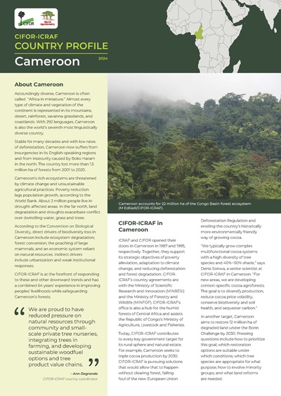 With its office established in Yaounde in 1987, CIFOR-ICRAF has been supporting Cameroon’s strategic objectives of poverty alleviation, reducing deforestation and forest degradation, and adaptation to climate change, through engagement in initiatives such as REDD+, Zero-deforestation Cocoa, and the African Forest Landscape Restoration Initiative (AFR100), in collaboration with national and international partners.