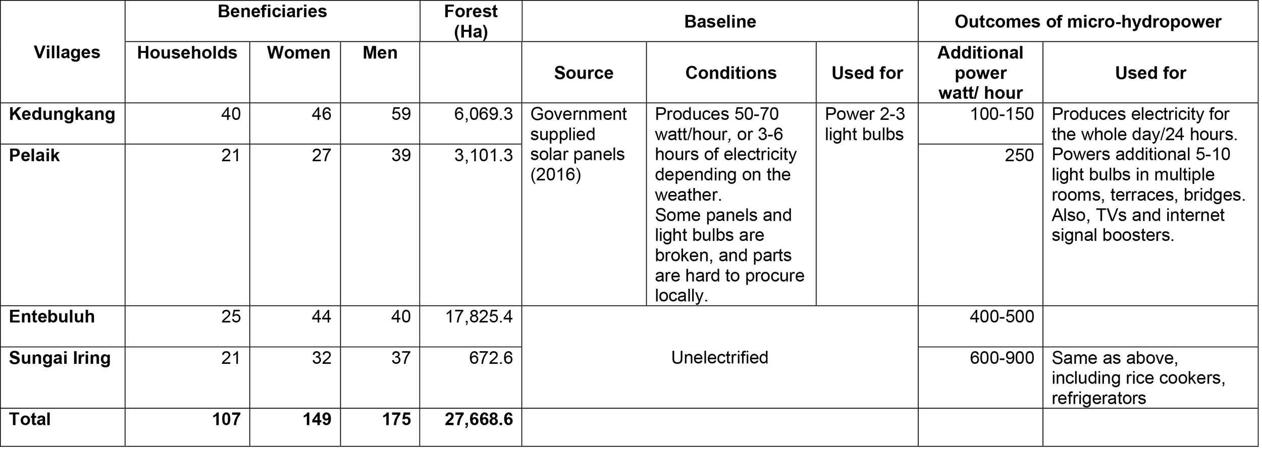 Women played active roles throughout construction and training. (left), and peer-to-peer training (right). Before-after conditions of the access to electricity in the four hamlets The community’s electricity grid now lights all rooms, terraces, walkways, and bridges are now connected to the community electricity grid. A significant improvement. When the lights came on, villagers exclaimed: “Water has generated light!”