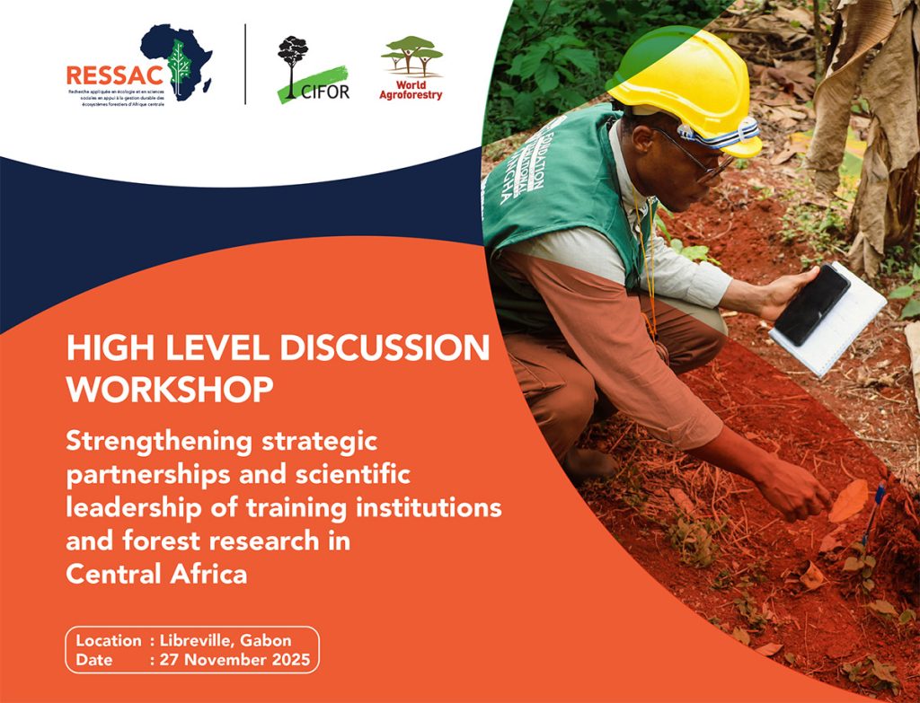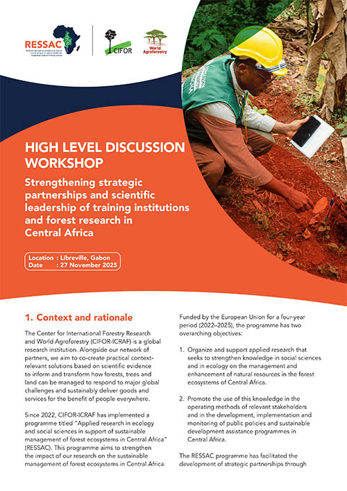 Since 2022, CIFOR-ICRAF has implemented a programme titled “Applied research in ecology and social sciences in support of sustainable management of forest ecosystems in Central Africa” (RESSAC). This programme aims to strengthen the impact of our research on the sustainable management of forest ecosystems in Central Africa.